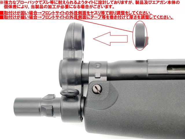 ■取付けが固い場合→本製品フロントサイトの外径側面をヤスリ等で削り調整をしてください。